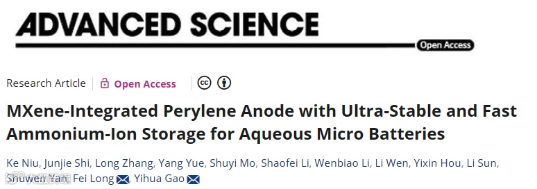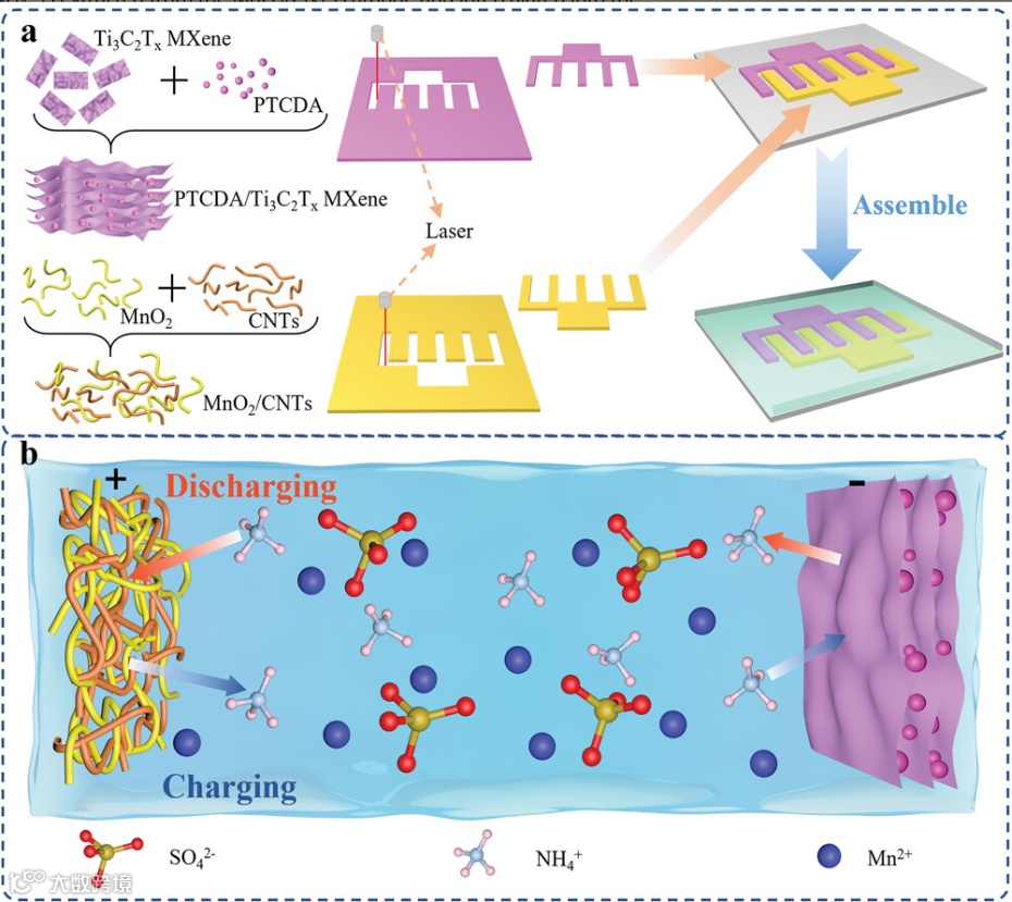 近日,来自华中科技大学的高义华教授与桂林理工大学的龙飞教授合作,在国际知名期刊Advanced Science上发表题为“MXene-Integrated Perylene Anode with Ultra-Stable and Fast Ammonium-Ion Storage for Aqueous Micro Batteries”的观点文章。该观点文章为了解决以苝-3,4,9,10-四甲酸二酐(PTCDA)为代表的苝材料的低电导率和NH4+嵌入/萃取过程中的溶解问题,将Ti3C2Tx MXene引入高导电性和极性表面端子作为导电骨架(PTCDA/Ti3C2Tx MXene)。以 NH4+作为电荷载体和 PTCDA/Ti3C2Tx MXene 阳极的 AMB 提供了出色的能量密度和功率密度、循环寿命和灵活性。