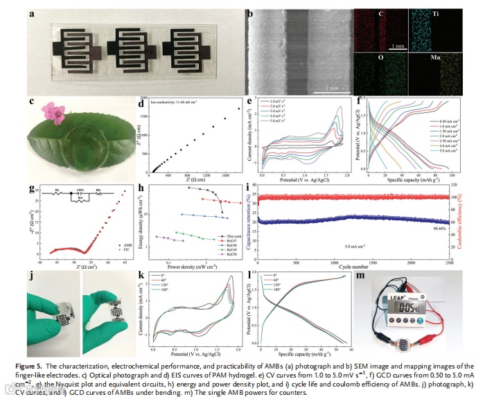 基于PTCDA/Ti3C2Tx MXene阳极的AMB通过激光雕刻工艺制造,具有优异的能量密度(66.05 µWh cm−2)和功率密度(2.61 mW cm−2)、循环寿命(在电流密度为5.0 mA cm−2时进行2500个GCD循环后为90.43%),并且具有柔韧性(180°下为94.79%)。