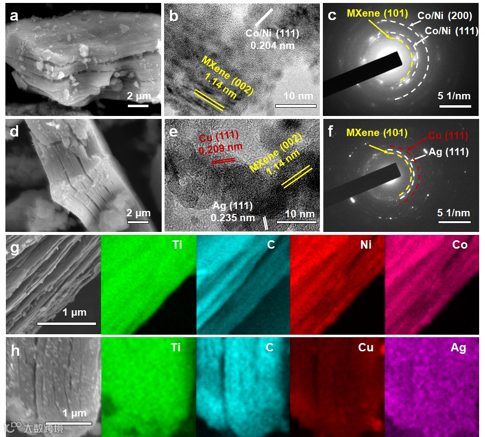 扫描电子显微镜(SEM)和透射电子显微镜(TEM)捕捉了所得样品的详细形貌和结构特征。如图 2a、d 所示,CNM 和 CAM 都呈现出二维分层风琴状结构,大量金属颗粒分别锚定在表面和层间。CNM 的高分辨率 TEM(HRTEM)显示出 0.204 nm 的明显晶格间距(图 2b),与 Co/Ni 的(111)平面相对应。因此,图 2e 显示的晶格距离 0.209 和 0.235 nm 分别与铜(111)和银(111)面一致。根据 CAM 的 SAED 图样,可以清楚地识别出 MXene (101)、Cu (111) 和 Ag (111) 三个不同的衍射环(图 2f)。这些结果表明,混合路易斯酸性熔盐蚀刻策略不仅能实现温和的 MAX 前驱体蚀刻,还能在 MXene 基底上引入均匀的双金属纳米颗粒。