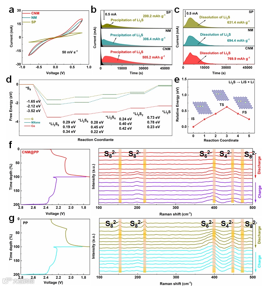 图 3. a) 在 50 mV s-1 的扫描速率下对称电池的 CV 曲线。不同电池的b)恒电位放电和 c) 充电曲线。d) 在 Co、MXene 和石墨烯上从 S8 到 Li2S 的放电过程的相对自由能。e) 钴衬底上 Li2S 的分解势垒曲线。在使用 f) CNM@PP 和 g) PP 隔膜的电池放电过程中测试的原位拉曼光谱。