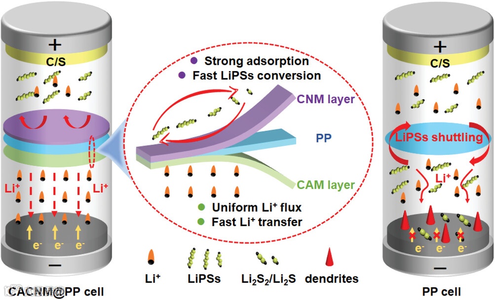 图1. CACNM@PP 示意图及其作为Li-S 电池隔膜的优势。