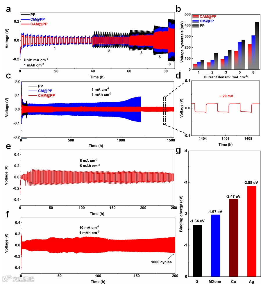 图 4. a) 在 1 至 8 mA cm-2 的不同电流密度下的倍率性能和 b) 相应的电压滞后。c) 在电流密度为 1.0 mA cm-2 和容量为 1.0 mAh cm-2 的条件下,PP、CM@PP 和 CAM@PP 对称电池的长期循环。d) 放大图显示了详细的电压曲线。e) 5 mA cm-2 (5 mAh cm-2)和 f) 10 mA cm-2 (1 mAh cm-2)电流密度下 CAM@PP 对称电池的循环性能。g) 锂原子与铜、银、MXene 和石墨烯基底之间的结合能。