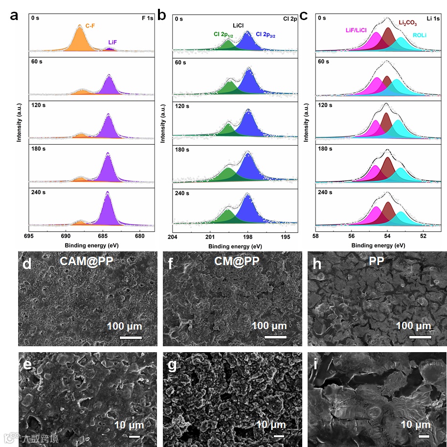 图 5:a) F 1s、b) Cl 2p 和 c) Li 1s XPS 深度剖面图(从上到下的深度光谱是在氩溅射后收集的。为清晰显示峰值,对每个元素信号的 XPS 强度进行了自动缩放,每列的强度刻度相同)。使用 d-e)CAM@PP、f-g)CM@PP 和 h-i) PP 分离剂循环后锂形态的顶视 SEM 图像。