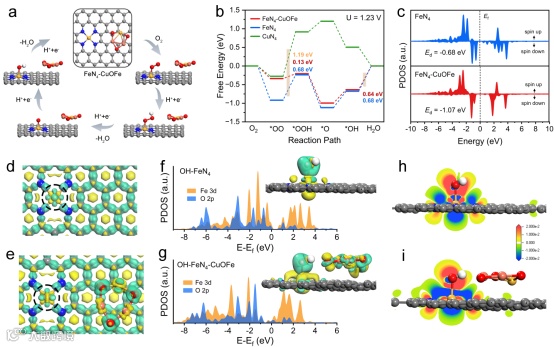 图 4. (a)FeN4-CuOFe 的完整 4e- ORR 路径。(b) ORR自由能图。(c)FeN4和FeN4-CuOFe 的 Fe-3d 轨道的 PDOS 计算曲线。(d) FeN4和 (e)FeN4-CuOFe 的原子差分电荷密度图。(f)FeN4和 (g)FeN4-CuOFe在*OH中的Fe-3d和O-2p轨道的PDOS计算曲线,插图:等值面显示的电荷差分密度。(h) FeN4和 (i)FeN4-CuOFe吸附OH后 的差分电荷密度切面图。在等值面显示中,电荷损耗和积累分别用黄色和青色表示。在二维图中,正电荷差值代表电子积累,负电荷差值代表电子离散。