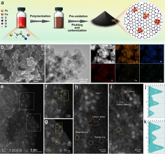 图 2.(a) AC-CuFe-NC 的合成示意图。(b) AC-CuFe-NC 的 FE-SEM 图像、(c) HR-TEM 图像、(d) EDS 元素图谱和 (e) HAADF-STEM 图像。(f) 图 1e 中矩形框 1 的放大图。(g) 图 1e 中矩形框 2 的放大图。(h) 图 1f 中矩形框 3 的放大图。(i) 图 1g 中矩形框 4 的放大图。(j) 图 1h 中 1 号线的强度曲线。(k) 图 1i 中 2 号线的强度曲线。