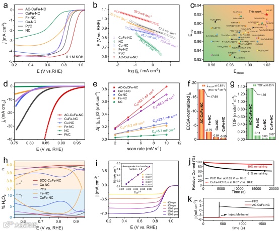 图 3:(a)ORR LSV。b)Tafel 图。(c) AC-CuFe-NC 与最近报道的催化剂的 ORR 性能比较。(d) ORR 动力电流密度曲线。(e) 1.1 V 时电容电流与扫描速率的关系与 RHE 的关系。(f) 0.85 V 时 ECSA 归一化动力学电流密度的柱状比较。(g) 0.85 V 时 TOF 的柱状比较。(h) 从 RRDE 测试中获得的电子转移数和过氧化氢产率。(i) 不同转速下 AC-CuFe-NC 的 LSV 曲线和 K-L 拟合曲线(插图)。(j) 计时电流测试。(k)耐甲醇测试。