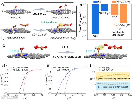 图 5. (a)FeN4和FeN4-CuOFe 结构上的O2和H2O协同吸附示意图。(b) 吸附O2或O2与H2O共吸附的吉布斯自由能变化。(c)FeN4-CuOFe 上 OH* 和H2O的协同共吸附。(d) AC-CuFe-NC 在 0.1 M NaOH 和 0.1 M NaOD 中的 ORR 动力电流密度。(e) CuFe-NC 在 0.1 M NaOH 和 0.1 M NaOD 中的 ORR 动力电流密度。(f) 根据 AC-CuFe-NC 和 CuFe-NC 的动力学电流密度计算出的 KIE 值。