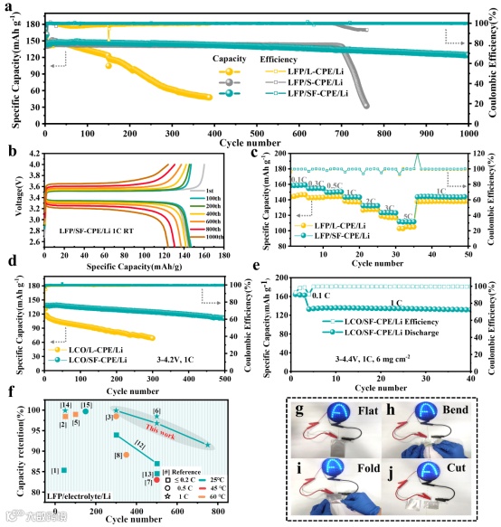 界面塑化策略带来的梯度模量结构使得SF-CPE界面处的模量大幅降低,表现出高的柔性(界面阻抗为43Ω),而基体内部仍具有高模量,显示出高的微观机械性能。界面塑化后的SF-CPE具有4.8×10-4 S cm-1的高离子电导率、0.15 eV的低的Li+传输活化能和的高Li+迁移数(0.61)。进一步的,通过稳定SEI膜的构建,在Li金属侧形成了稳定的界面,抑制了SN与Li的副反应。因此,优良的Li+传输性能和稳定的界面使得Li-Li对称电池(Li-Li:在0.1 mA cm-2下稳定循环1000 h)和全电池(LFP-Li:在2.5-4.0 V,1.0 C下1000次循环后的容量保持率为86.1%;LCO-Li:在3-4.2 V,1.0 C下500次循环后的容量保持率为80.4%)表现出优异的循环性能。
