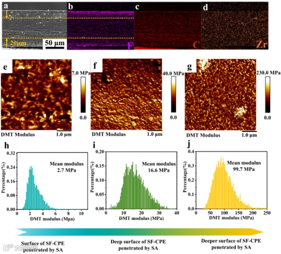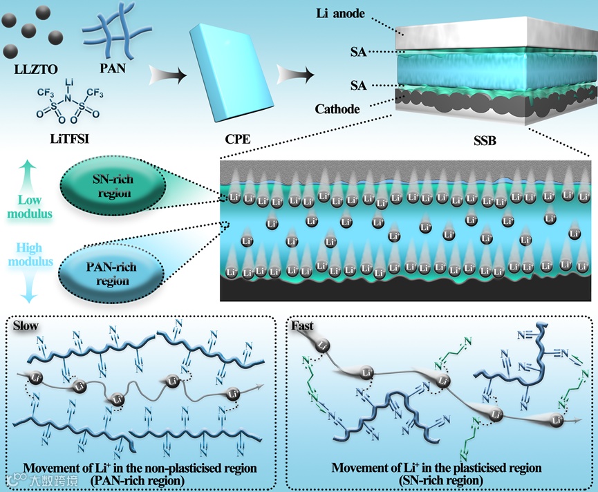 界面上的SN能对CPE中的PAN产生强烈的塑化作用,从而大幅降低PAN的结晶度,使CPE表面获得低模量,但内部仍保持着高的模量。PAN结晶度的降低提供了更多的无定形区域,有利于Li+的传输;梯度模量结构不仅确保了紧密的界面接触,还有利于抑制锂枝晶的生长。