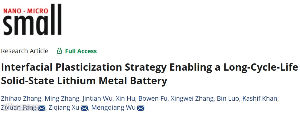 近日,来自电子科技大学的吴孟强教授、徐自强研究员和方梓烜博士,在国际知名期刊Small上发表了题为“Interfacial plasticization strategy enabling a long-cycle-life solid-state lithium metal battery”的文章。该文章提出了一种界面塑化改善复合固态电解质界面的策略,分析了界面塑化策略的机理并详细证明了界面塑化产生的梯度模量结构,同时论述了界面塑化策略带来的各项增益效果。