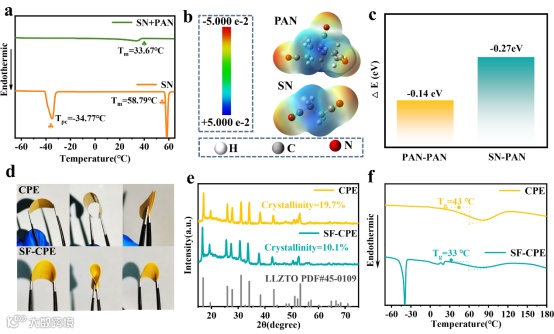 由于PAN和SN具有相同的官能团,因此它们之间可以实现良好的相容性。SN对PAN的塑化效果通过DSC以及FTIR进行了分析和证明。为了进一步验证SN与PAN之间的相互作用以及SN对PAN的增塑作用,我们对该体系进行了理论计算。首先计算了PAN和SN的静电势(ESP),以确认其对应的电负性原子和正电性原子。从图2b中可以看出,PAN和SN中的N原子都带有明显的负电荷,这导致了PAN和SN之间强烈的相互作用。除此之外,图2c中分别显示了PAN-PAN、SN-PAN体系的结合能。如图2c所示,SN与PAN的结合能为-0.27 eV,而PAN-PAN的结合能则小得多(-0.14 eV),这表明SN很容易与PAN发生相互作用并吸附到PAN分子链上,从而达到塑化的效果。XRD图谱(图 2e)表征了界面塑化前后PAN的结晶区和无定形区的相对比例,表明界面塑化策略能大幅降低PAN的结晶度。