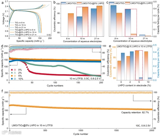 图3. LMO//TiO2@x% LHPO (x = 0、2、5和10全电池(P/N质量比为2:1)的电化学性能。(a)、(b)、(c)不同盐浓度(8m、10m、21m)下的充放电曲线及200次循环后所对应的平均库仑效率和容量保持率。(d)和(e)循环性能及其对应的平均库仑效率和200次循环后的容量保持率。(f) LMO//TiO2@5% LHPO全电池在10 m LiTFSI水溶液中的长期循环稳定性。