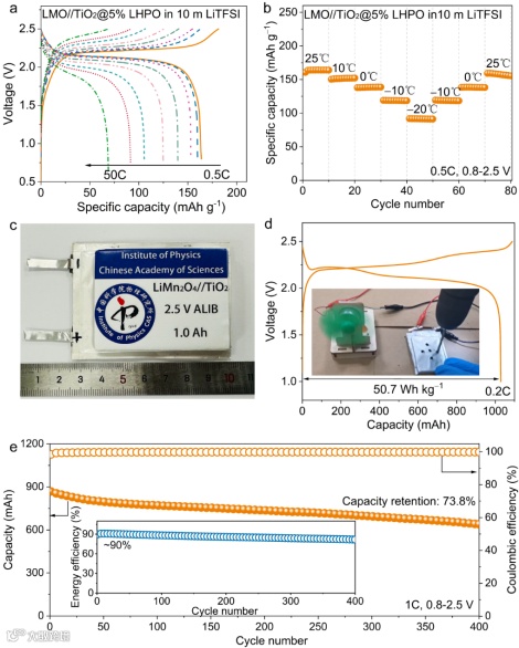 图6. LMO//TiO2@5% LHPO 全电池在10 m LiTFSI电解液中的电化学性能。(a)全电池在不同电流密度下的充放电曲线(倍率性能); (b)全电池低温性能; (c) Ah级LMO//TiO2软包电池实物图; (d) Ah级LMO//TiO2软包电池在10 m LiTFSI电解液中0.2C电流密度时的充放电曲线; (e) Ah级LMO//TiO2软包电池循环性能图。