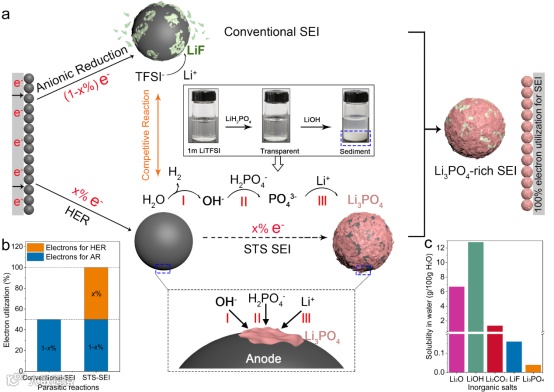 图1 (a)传统和“时空同步”SEI的构建机制示意图(附图:Li3PO4生成的化学法验证);(b)根据副反应的电子利用率计算的SEI生成效率(SFE);(c) 水系锂离子电池SEI中主要组分在纯水中的溶解度。