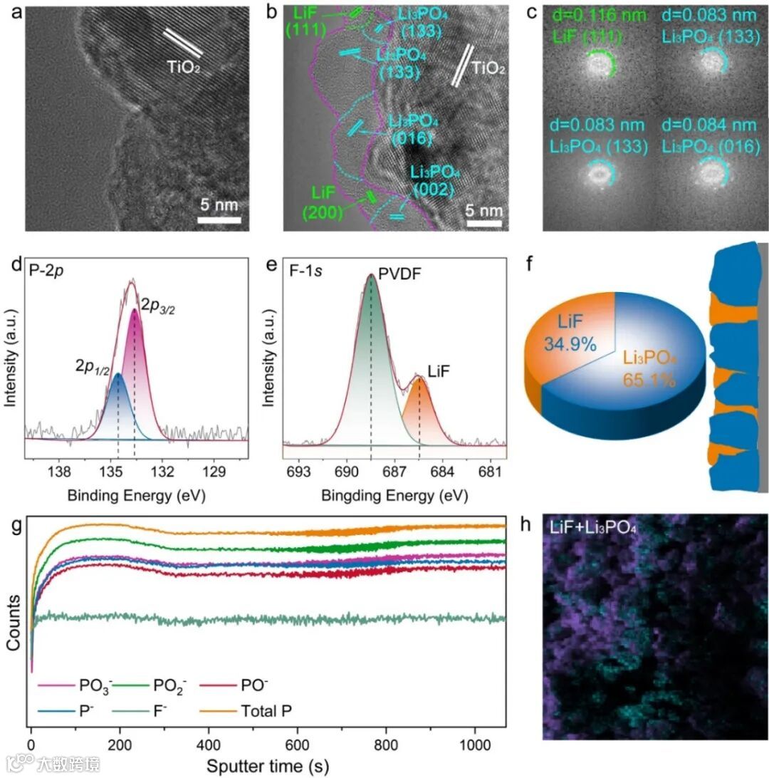 图5. LMO//TiO2@5%LHPO全电池在0.5C电流密度下循环10次后,在负极表面富Li3PO4的SEI的形成。(a)TiO2电极和(b)TiO2@5%LHPO电极在0.5C电流密度循环10次后的HERTEM图像。(c)TiO2@5%LHPO电极在0.5C电流密度循环10次后的FFT拟合结果。TiO2@5%LHPO电极在0.5C循环10次后的(d)P-2p和(e)F-1s XPS光谱。(f) 通过XPS拟合得出的TiO2@5%LHPO电极上的SEI成分占比。利用ToF-SIMS技术对循环后的TiO2@5%LHPO电极进行了界面化学成分分析结果(g)以及对应的(h)二维分布图。