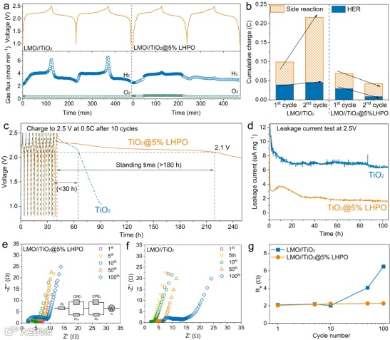 图4. LMO//TiO2@5%LHPO全电池在10 m LiTFSI中前两个循环过程中的SEI形成质量(SFQ)。(a)前两个循环的H2/O2气体析出分析。(b)根据(a)的DEMS结果计算的副反应和HER的累积电荷量。(c) 100%荷电状态下的自放电率。(d) 2.5 V恒电位下的弛豫电流。(e) LMO//TiO2@5% LHPO和(f) LMO//TiO2全电池的循环过程中那个EIS演化。(g) 在1、5、10、50、100次循环后两个全电池的EIS的Re值。