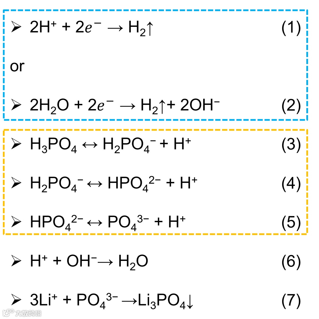 在水系电池充电过程中,负极的锂化过程降低了负极材料的工作电位,从而触发了包括HER和TFSI−阴离子还原为LiF在内的的电解液分解反应。随着HER 的进行,OH−继续在负极表面上积累,如公式(1)和(2)所示。溶解的H2PO4−有效地利用这些析氢副产物同步发生化学转化形成了富含Li3PO4的SEI 保护层。根据前人研究,多元弱酸(如H2CO3、H2C2O4、H3PO4等)在水溶液中存在着多级电离平衡,如公式(3)~(5)所示。本文选择性能温和的LiH2PO4来实现这一策略,在负极界面出,H2PO4−的电离度随着OH−浓度的增加而升高,这是因为pH值的升高将耗尽H+(如公式(6)所示),多元弱酸H3PO4的三级电离平衡逐渐向右移动,形成PO43−。最后,多元弱酸的最终电离产物PO43−将与电解液水溶液中的Li+结合,生成不溶性盐Li3PO4,如公式(7)所示。“时空同步”SEI的形成机制示意图如图1a所示。