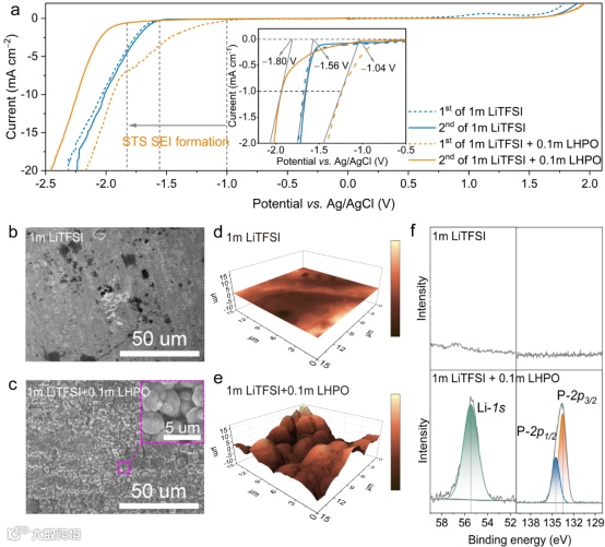 图2(a)在钛电极上以10 mV/s扫描速率测量的1 m LiTFSI和1 m LiTFSI + 0.1 m LiH2PO4水系电解液的电化学稳定窗口。在1 m LiTFSI和1 m LiTFSI + 0.1 m LiH2PO4水系电解液中,以饱和氯化银为参比电极,经过两次LSV扫描后,(b)在1 m LiTFSI水系电解液中,钛箔的SEM图像;(c)在1 m LiTFSI + 0.1 m LiH2PO4水系电解液中,钛箔的SEM图像;(d)1 m LiTFSI+0.1 m LHPO和(e)1 m LiTFSI水系电解液中Ti电极的AFM图像(15 × 15 µm2);以及(f)钛箔表面Li-1s和P-2p的XPS谱。