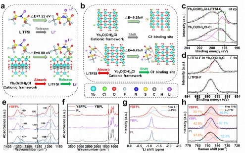 通过密度泛函理论(DFT)计算分析了阴离子交换前后元素结合能的变化,在电解质基质中加入阳离子骨架纳米线显著降低了Li+与TFSI-之间的结合能,这表明Li+在YBFPL电解质体系中的迁移率增加;计算同样分析了阴离子交换前后Cl-结合位点的变化,揭示无序活性的Cl-存在于正电荷聚集的阳离子骨架中,可以诱导与TFSI-阴离子自发的阴离子交换。XPS分析对阴离子交换理论进行了进一步验证。此外,通过红外测试、固态核磁测试以及拉曼测试表明了阳离子骨架纳米线的掺入促进了锂盐(LiTFSI)的解离,增加了可移动Li+的浓度,最终提高了Li+的运输效率。