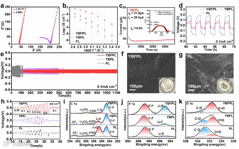 图3:复合固态电解质的电化学表征。(a)YBFPL、YBPL和PL电解质在25 ℃时的EIS曲线。(b)在不同温度下YBFPL、YBPL和PL电解质的阿伦尼乌斯图。(c)Li||YBFPL||Li电池的电流-时间曲线,插图为极化前后的EIS曲线。(d-e)在0.1 mA cm-2电流密度下,(d)60-70 h,(e)0-1100 h,锂金属的镀/剥离曲线。(f)Li||YBFPL||Li和(g)Li||PL||Li电池循环结束后锂金属表面的SEM图像。(h)逐步增加电流密度时,Li||CSEs||Li电池的恒流镀/剥离曲线。(i-k)YBFPL、YBPL和PL电解质分别循环1100 h、500 h和100 h后,锂金属表面的(i)C 1s、(j)F 1s和(k)O 1s的XPS光谱。