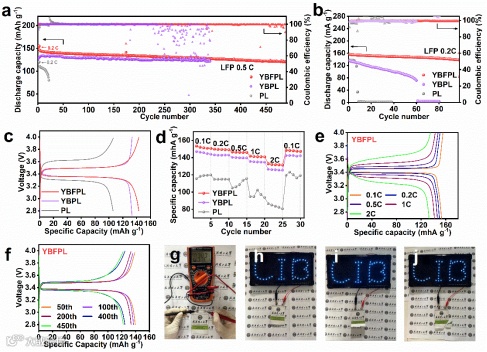 图5:组装锂固态电池的电化学性能。(a)0.5 C和(b)0.2 C下LiFePO4||CSEs||Li固态电池的循环性能。(c)第10次循环后LiFePO4||CSEs||Li固态电池的充放电曲线。(d)LiFePO4||CSEs||Li固态电池在0.1 C、0.2 C、0.5 C、1 C和2 C下的倍率性能。(e)不同倍率下LiFePO4||YBFPL||Li固态电池的电压-容量曲线。(f)LiFePO4||YBFPL||Li固态电池在50、100、200、400、450次循环下的电压曲线。(g)LiFePO4||YBFPL||Li软包电池开路电压测试光学照片。(h-i)LiFePO4||YBFPL||Li软包电池在(h)平面、(i)折叠和(j)切割条件下点亮LED的光学照片。