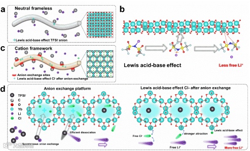 阳离子骨架纳米线可以为TFSI-阴离子提供自发的阴离子交换平台。在带有正电荷场聚集的骨架纳米线中,无序且活泼的Cl-容易与TFSI-发生阴离子交换反应,导致锂盐聚集体(LiTFSI)快速解离。同时,锂盐中的TFSI-阴离子占据了无序且活性Cl-的位置。因此,Cl-脱离骨架的内部结构,分布在阳离子骨架纳米线与聚合物的界面上。阴离子交换发生后,基于路易斯酸碱效应,自由的Cl-可被阳离子骨架纳米线上的Yb3+吸引,而不是直接形成LiCl。这一过程有助于释放更多的游离Li+进入系统,显著提高离子电导率。