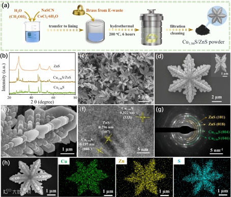 我们创新性地提出了一种利用电子废弃物中的合金黄铜作为异质结原材料的合成策略,通过简单的一步水热法成功合成了具有大面积、均匀分布雪花状结构的Cu1.94S/ZnS异质结构材料,并对Cu1.94S/ZnS异质结材料进行了全面的储钠性能表征和密度泛函理论计算。