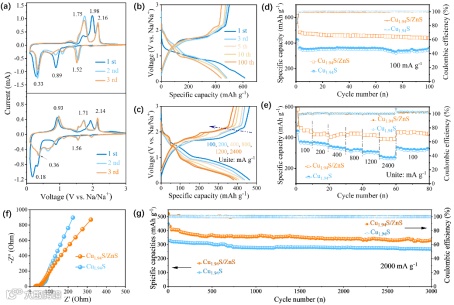 得益于Cu1.94S/ZnS异质结构界面处的协同耦合作用,异质结构中的电荷再分布诱导了内部电场,从而促进了电荷转移,增强了表面反应动力学。此外,放电阶段异质结构的演变可以促进ZnS的完全合金化反应,从而提高电极的可逆容量。基于该Cu1.94S/ZnS负极的电池表现出优异的电化学性能,在100 mA g-1的电流密度下放电容量为440 mAh g-1,在2000 mA g-1的电流密度下循环3000次后放电容量仍有335 mAh g-1。因此,这种制备异质结构的合成方法为寻找高性能钠离子电池负极提供了一种新的绿色和可持续的途径。