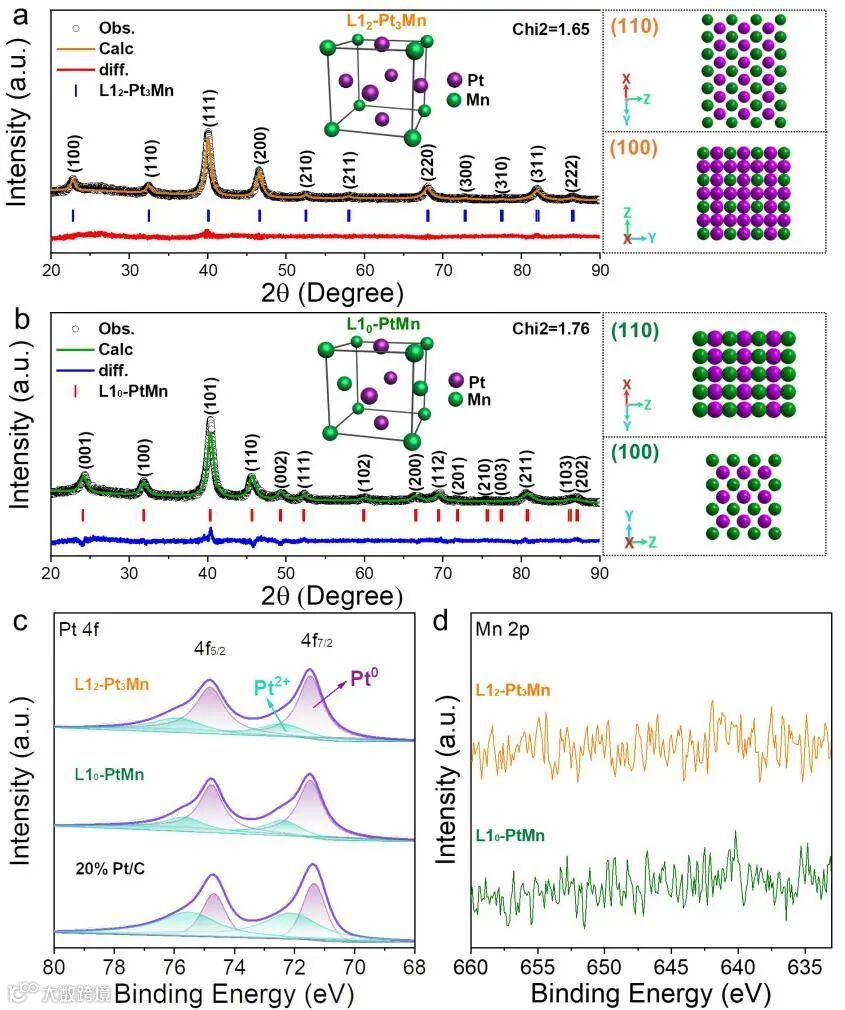图2. L12-Pt3Mn及L10-PtMn金属间化合物的XRD及XPS图谱。