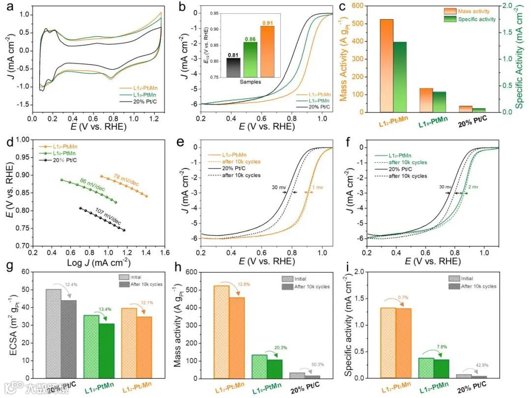 图5. L12-Pt3Mn及L10-PtMn金属间化合物的ORR活性及稳定性测试。