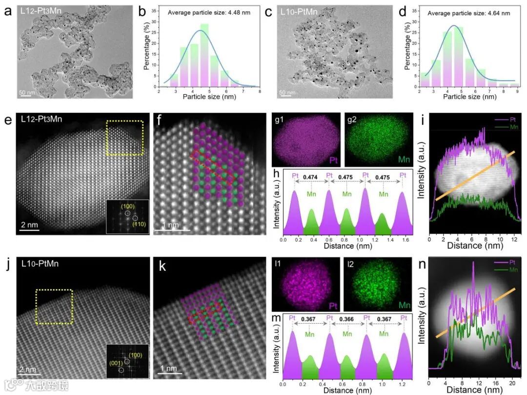 图3. L12-Pt3Mn及L10-PtMn金属间化合物的相关电镜表征。