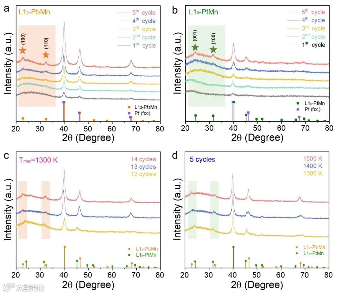 图4. (a-b) L12-Pt3Mn及L10-PtMn在不同热冲击次数时的XRD图谱;(c-d) 热冲击次数及热冲击温度对于相转变的影响。