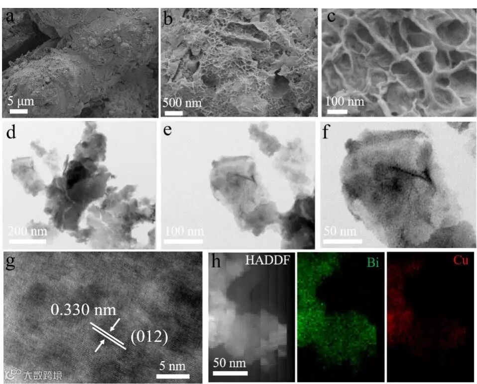 图2. Bi9Cu1/CC合金纳米片的(a-c) SEM, (d-f) TEM, (g) HRTEM和(h)EDS元素分布图。