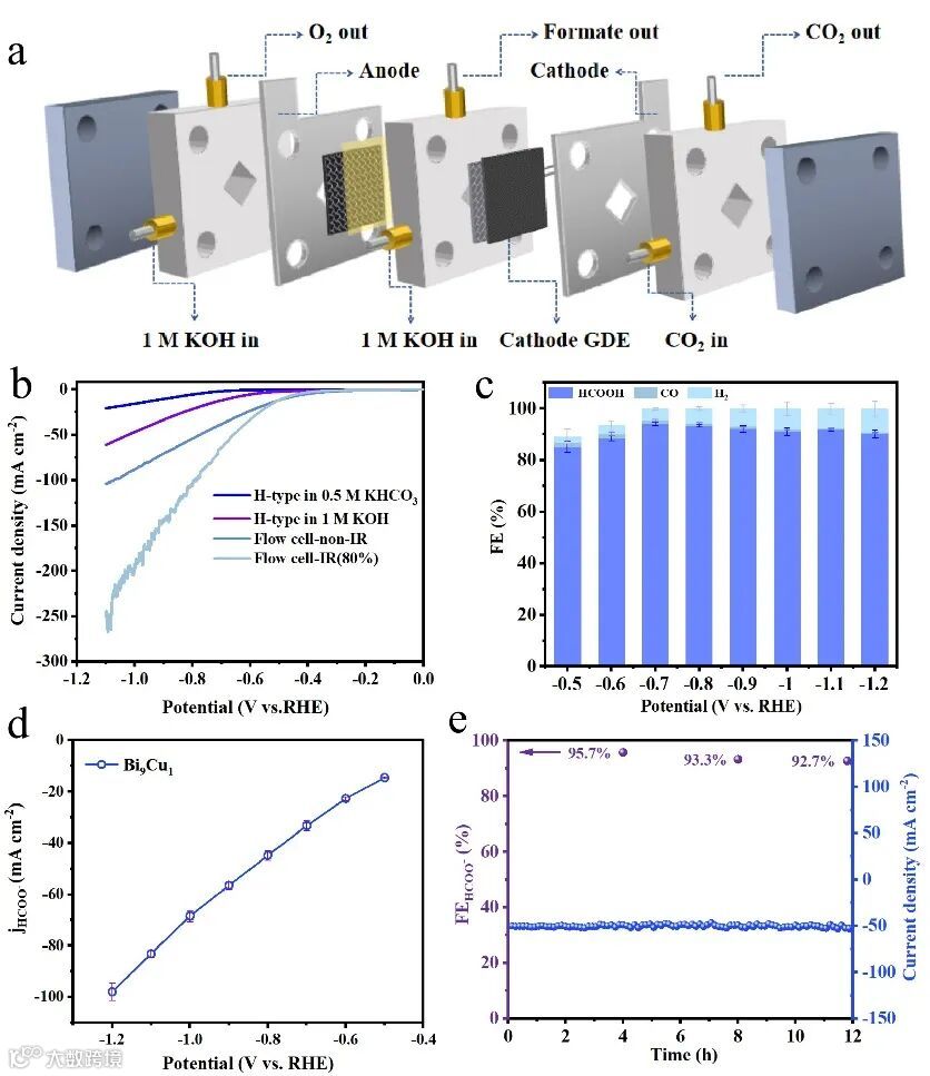 图4. Bi9Cu1/CC电催化剂在Flow-Cell中的电化学性能测试结果