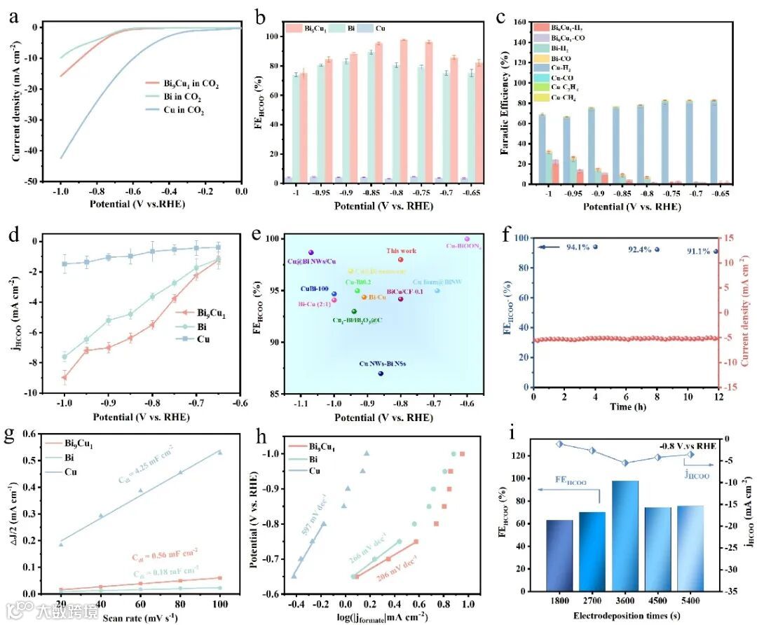 图3. Bi9Cu1/CC催化剂在H-Cell中的电化学性能测试结果