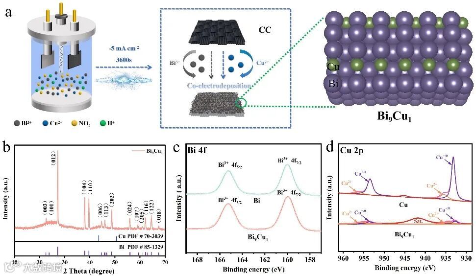 图1. (a) Bi9Cu1/CC催化剂的合成示意图, (b) XRD图,(c) Bi 4f 和(d)Cu 2p XPS图。