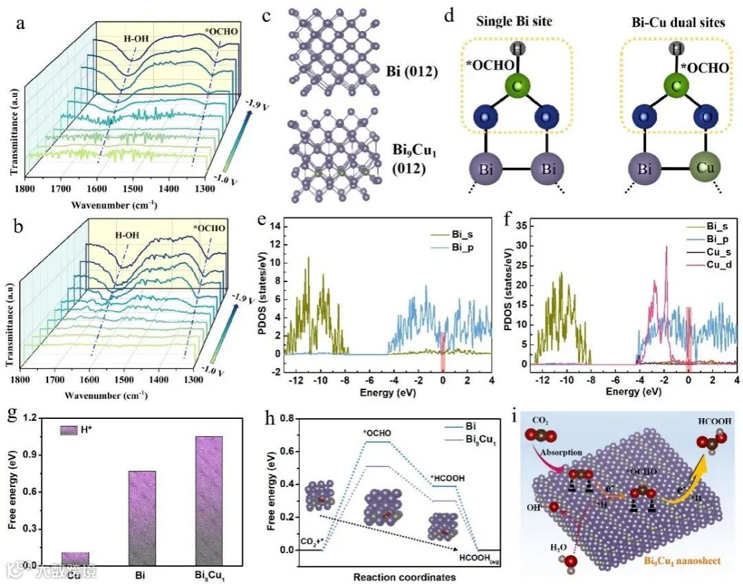 图5.Bi9Cu1/CC催化剂的原位ATR-IR测试和密度泛函理论计算结果