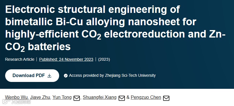 近日,来自浙江理工大学化学与化工学院的陈鹏作研究员,在国际知名期刊Nano Research上发表题为“Electronic structural engineering of bimetallic Bi-Cu alloying nanosheet for highly-efficient CO2 electroreduction and Zn-CO2 batteries”的文章。该文开发了一种简便的电化学共沉积策略,在碳布上合成了双金属Bi9Cu1合金纳米片(Bi9Cu1/CC),为电催化CO2还原反应(CO2RR)提供了一种新型的自支撑电极。Bi9Cu1/CC催化剂在-0.7 V到-1.2 V vs. RHE的宽电位范围内对甲酸盐具有超过90%的高法拉第效率(FE)。此外,以Bi9Cu1/CC为阴极驱动的可逆Zn-CO2电池的最大功率密度为1.4 mW cm−2,且具有良好的工作稳定性。实验表征和电化学结果证实,Cu合金化构建的双金属催化活性位点,增强了Bi9Cu1合金纳米片的界面电子转移以实现显著提升的反应动力学过程。此外,原位ATR-IR结果证实双金属Bi-Cu活性位点倾向于遵循*OCHO中间体的电催化转化途径。DFT计算表明,Cu合金化有助于提高Bi费米表面附近的态密度,实现更高的本征导电性,且能优化*OCHO中间体在金属位点上的吸附并抑制析氢反应过程,最终使得Bi9Cu1合金纳米片展现出优异的CO2RR催化活性和循环稳定性。