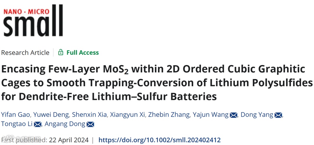 近日,来自复旦大学的董安钢研究员、杨东教授与李同涛研究员团队联合温州大学王亚军教授团队,在Small上发表题为“Encasing Few-Layer MoS2within 2D Ordered CubicGraphitic Cages to Smooth Trapping-Conversion of Lithium Polysulfides for Dendrite-Free Lithium–Sulfur Batteries”的观点文章。该观点文章采用了一种由自组装纳米晶体超晶格形成的单层互连立方笼构建的二维介孔类石墨烯框架(MGF),并将其作为支撑骨架用于外延生长富含硫空位的MoS2层(MoS2@MGF)。MoS2@MGF中间层的引入不仅有效地捕获了多硫化锂(LiPSs),减轻了穿梭效应,还抑制了锂枝晶的生长,延长了电池的使用寿命。