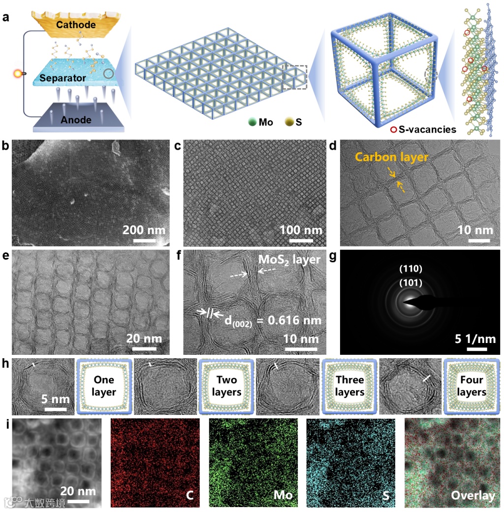 图 1.(a)MoS2@MGF作为锂硫电池中间层的示意图。MGF 的(b)SEM、(c)TEM 和 (d) HRTEM 图像。MoS2@MGF的(e)TEM、(f)HRTEM和(g)SAED 衍射图。(h)HRTEM图像显示单个立方笼内具有不同层数的弯曲MoS2。(i)STEM图像和相应的元素映射。