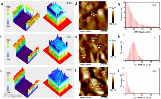 中子成像显示气袋中残留的液态电解质在温度升高时减少,即电解质的消耗在温度升高时增加。电极位置的中子透过率随着电池测试温度的升高而降低,这表明在高温下形成的SEI含量较高。高温老化电池的SEI颗粒团聚为300~400nm的团聚结构,杨氏模量分布下降,这表明在高温下形成的SEI的机械稳定性较差。全电池和对称电池的电化学阻抗分析表明磷酸铁锂//石墨电池的动力学变化主要归因于阳极的动力学变化。电荷转移阻抗,尤其是负极的电荷转移阻抗(Rct),是磷酸铁锂//石墨电池的动力学限制步骤。65℃高温下循环的电池,其寄生反应副产物的生长增多,导致动力学性能迅速下降。