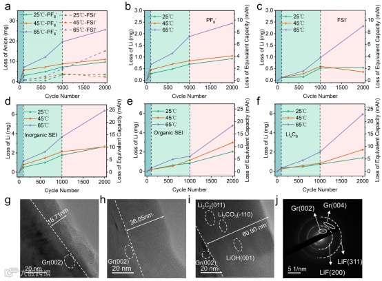 系统地分析显示,在所有三个温度下,SEI演变的模式相似,即阴离子分解形成的LiF是老化初期SEI的主要成分,ROCO2Li的比例随着老化的增加而增加。不同之处在于,在25 ℃时,由于存在动力学活化过程,不可逆LixC6的比例在老化初期最高,并随着循环而降低。相反,在65 ℃时,不可逆LixC6的比例会随着循环而继续增加。LixC6的不可逆形成受动力学性能的影响很大,可作为评估老化过程动态性能的指标。此外,在65℃样品中观察到的加速老化期对应着FSI-的快速消耗。