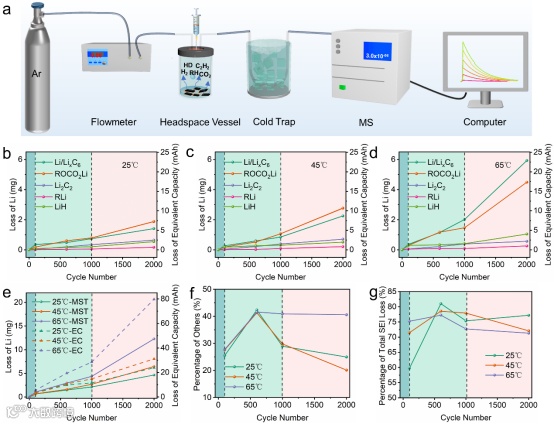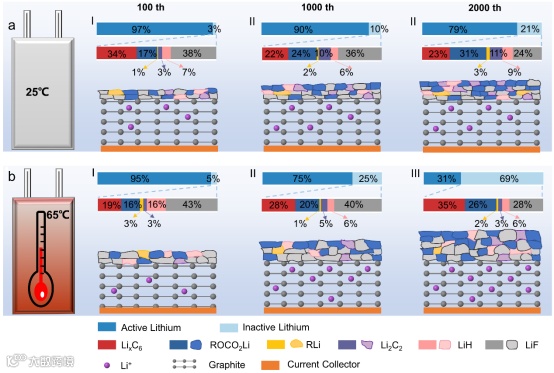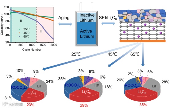 图1. 不同温度下磷酸铁锂//石墨电池老化规律及非活性锂组成。