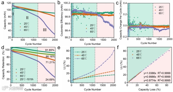 磷酸铁锂//石墨电池在 25、45 和65 ℃下循环2000次的电化学性能表明在25和 45 ℃下,老化电池存在活化期和线性衰减期,而在 65 ℃下存在额外的加速衰减期。在线性衰减阶段,25、45和65 ℃下平均每圈容量衰减分别为0.0077、0.0155和0.0266 mAh。以25 ℃时的平均容量衰减为基准,45和65 ℃测试的电池的衰减率分别为2.01倍和3.45倍。在"III"加速衰减阶段,65 ℃时每循环的平均容量衰减为0.0655 mAh,衰减率为8.51倍(相比于25 ℃时的"II"阶段)。热力学分析表明电池容量损失与活性锂损失之间存在强线性关系(y=x,R2>0.999)。这表明,在温度加速老化条件下,磷酸铁锂//石墨电池的容量损失的主要机制是活性锂存量的损失。
