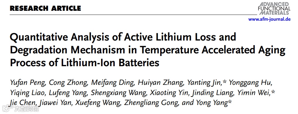 近日,来自厦门大学的杨勇教授,宁德时代新能源科技股份有限公司21C创新实验室魏奕民博士与西湖大学的金艳婷博士合作,在国际知名期刊Advanced Functional Materials上发表题为“Quantitative Analysis of Active Lithium Loss and Degradation Mechanism in Temperature Accelerated Aging Process of Lithium-ion Batteries”的研究文章。该研究文章从活性锂损失分析的角度对磷酸铁锂//石墨电池的高温老化机制进行了系统的定量分析。结合质谱滴定、核磁共振、冷冻电镜和中子成像等技术多方面量化了6种非活性锂组分和含量,并阐明了其在长期循环中的演变规律,深入揭示了高温老化锂离子电池失效机制。