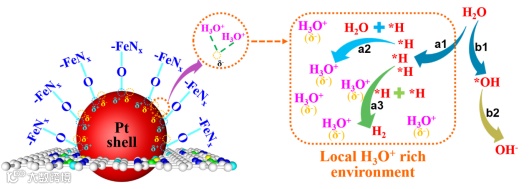 图5. IISS Pt3FeNP-in-Fe SA催化剂在碱性介质中催化HER的示意图,在一些局部区域遵循酸性HER机制。