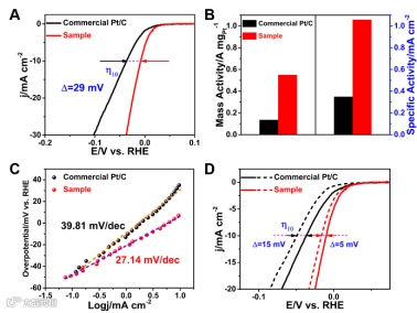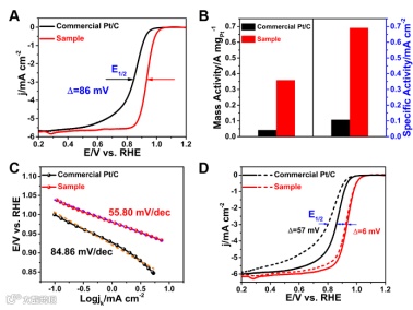 析氢反应(HER)和氧还原反应(ORR)是燃料电池中涉及的两个重要电极反应。然而,HER在碱性介质中的反应速率比在酸性介质中低2~3个数量级。这是因为碱性HER中H2主要由H2O解离产生,而不像酸性HER中直接来源于H+离子。尽管在酸性HER反应中Pt基催化剂对H物种具有最佳吸附能力,但在碱性HER中它们对H2O的解离的能力仍然不令人满意。同时,在酸性ORR中Pt基催化剂对反应中间体吸附能力仍过强,因此其反应动力学也相对较慢。对于Pt基催化剂来说,碱性HER中H2O解离步骤是其速率决定步骤。而酸性ORR中反应中间体*OH的解吸附是其速率决定步骤。在两种反应过程中,*OH中间体扮演者重要角色,*OH的快速解吸附不仅可以提高酸性ORR性能,还可以通过促进H2O的解离从而提高碱性HER性能。因此,在本工作中,利用Pt3FeNPs和Fe SAs之间的电子相互作用精细调节*OH中间体的解吸附能力,成功的加速了碱性HER中H2O的解离和酸性ORR中*OH的解吸附,同时实现了它们在碱性HER和酸性ORR的高效电催化性能。