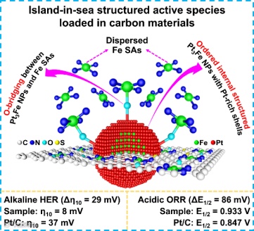 负载在碳材料中的海岛结构的Pt3Fe纳米颗粒-Fe单原子可作为优异的碱性HER和酸性ORR反应活性的电催化剂