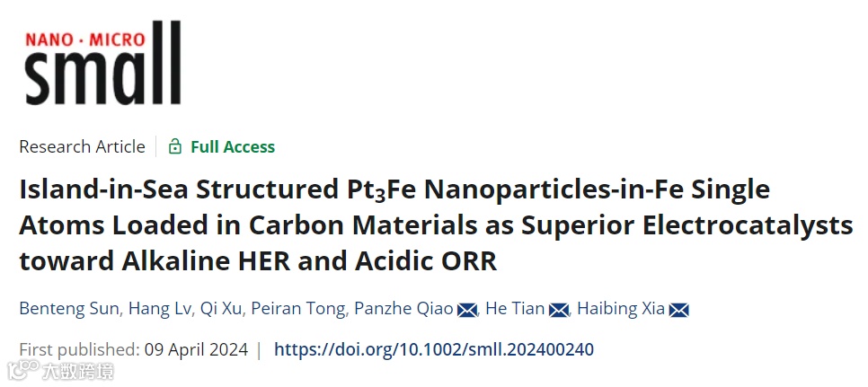 近日,来自山东大学的夏海兵教授与浙江大学的田鹤教授,上海同步辐射光源的乔盼哲研究员合作,在国际知名期刊Small上发表了题为“Island-in-Sea Structured Pt3FeNanoparticles-in-Fe Single Atoms Loaded in Carbon Materials as Superior Electrocatalysts toward Alkaline HER and Acidic ORR”的研究论文。该研究报道了一种具有海岛结构的IISS Pt3FeNP-in-Fe SA新型电催化剂,并探究了其优异的碱性HER和酸性ORR的活性来源。利用聚苯胺(PANI)水凝胶中PANI-Fe-TA复合物的空间限域作用,通过调整Fe3+和Pt2+的浓度以及热解条件,操控Pt3FeNPs的内部结构的有序度和合适的Pt壳厚度,实现Pt3FeNPs与Fe SAs之间的O桥接。它们之间的协同作用有助于在碱性HER中加速H2O的解离,从而在Pt3FeNPs表面呈现局部酸性环境,并提高*OH中间体在酸性ORR中的解吸附速率。这些都有助于提高它们的电催化活性和稳定性。在该研究中所提出的空间限域作用有望为制备Pt基/M-N-C电催化剂提供了新的制备思路。