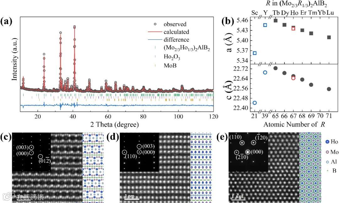 图1(a)(Mo2/3Ho1/3)2AlB2的XRD精修图谱,(b) ((Mo2/3Ho1/3)2AlB2的晶胞参数对比;(Mo2/3Ho1/3)2AlB2AlB2沿(c)[100], (d)[-110], (e)[001]轴的STEM-HAADF及选区电子衍射图像